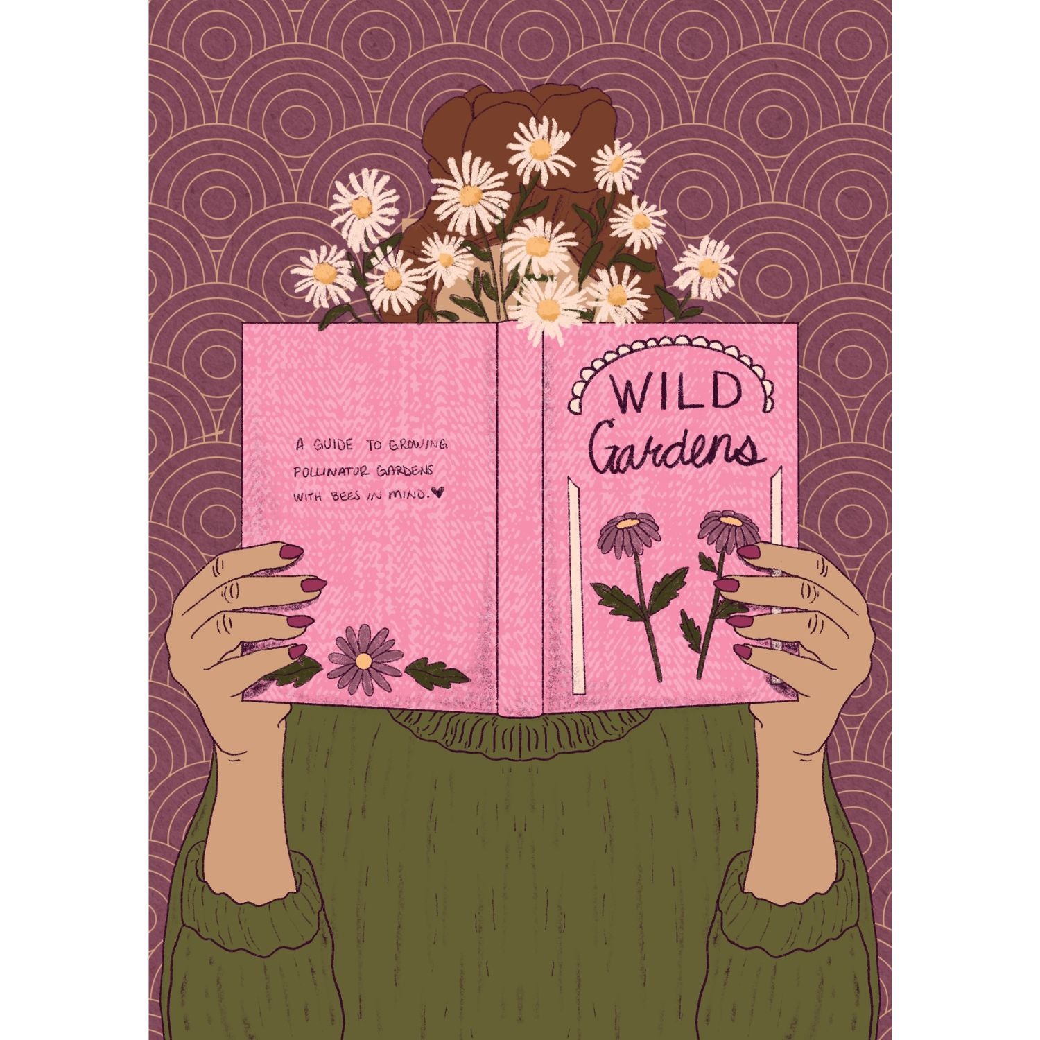 This print features a woman reading a wildflower gardening book in a big cozy sweater surrounded with daisy flowers.